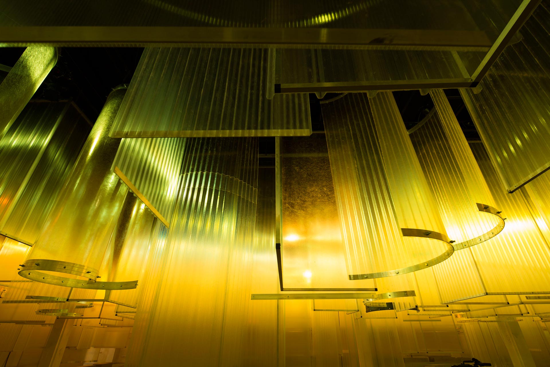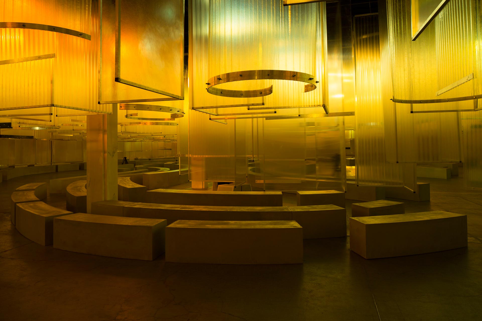Die Proportionen und Perspektiven des rohen, industriellen Raums werden durch Stalaktiten aus Glasfaser und Polycarbonat manipuliert. Diese abwechselnden Sichtebenen und Transparenzen präsentieren den Besuchern einen verschwommenen Horizont.