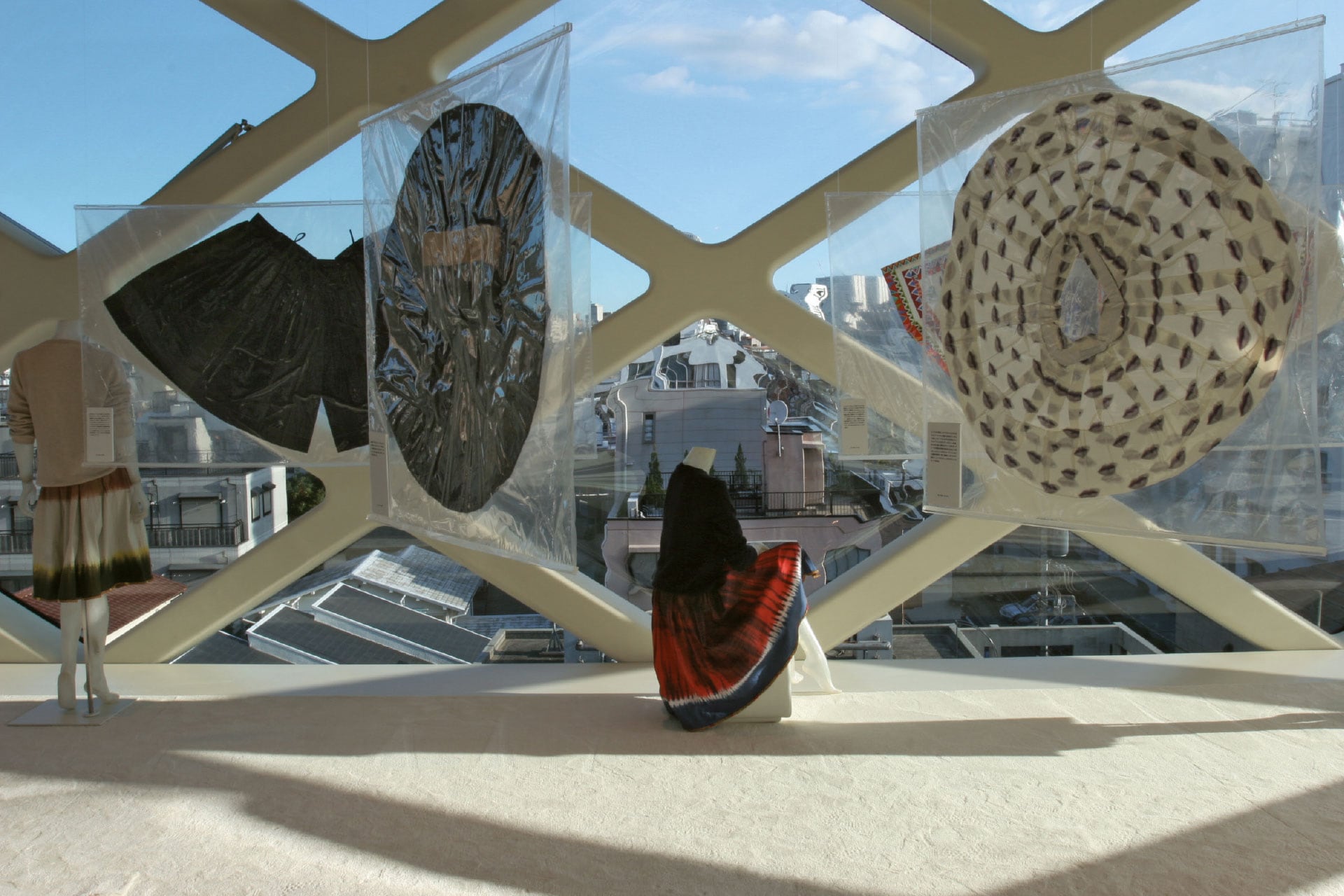 One of the most striking spaces was the top floor, where gigantic 2D mannequins were suspended in a radial formation. Their mirrored backs reflected Tokyo’s downtown stretching outside the glass façade, creating a mysterious merger between skyline and skirts.