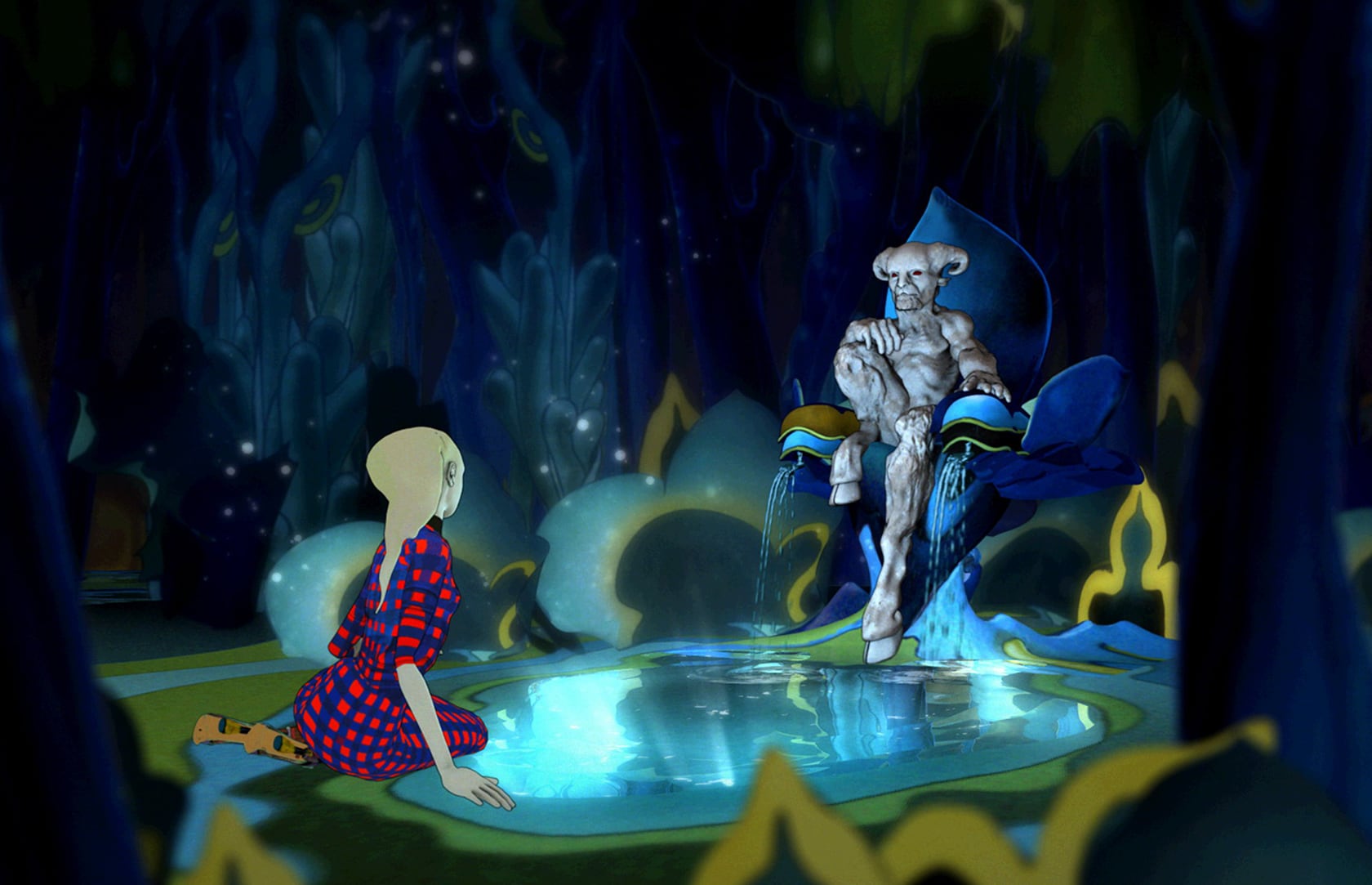 While the technology is cutting edge, the concept is essentially the same as classic animation in which artists drew over filmed footage of an actress dancing to create Snow White. For "Trembled Blossoms" the motions of a dancer playing the Nymph, outfitted with small tracking reflectors, are captured and recorded, then digitally superimposed onto the drawings. Great care was taken to capture the quality and spirit of the original drawings.