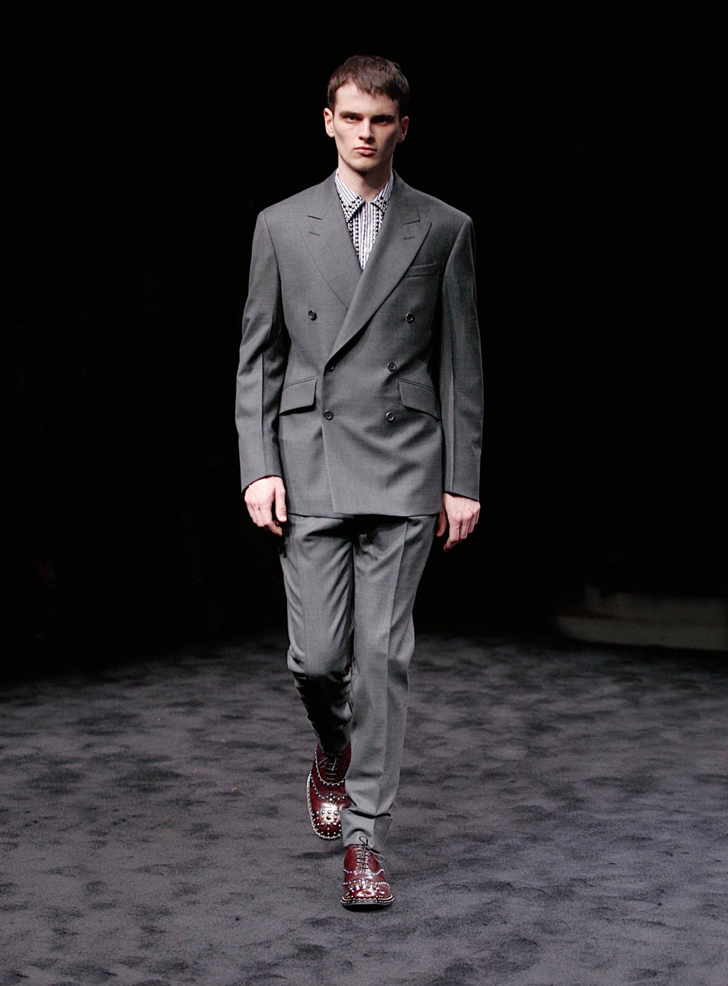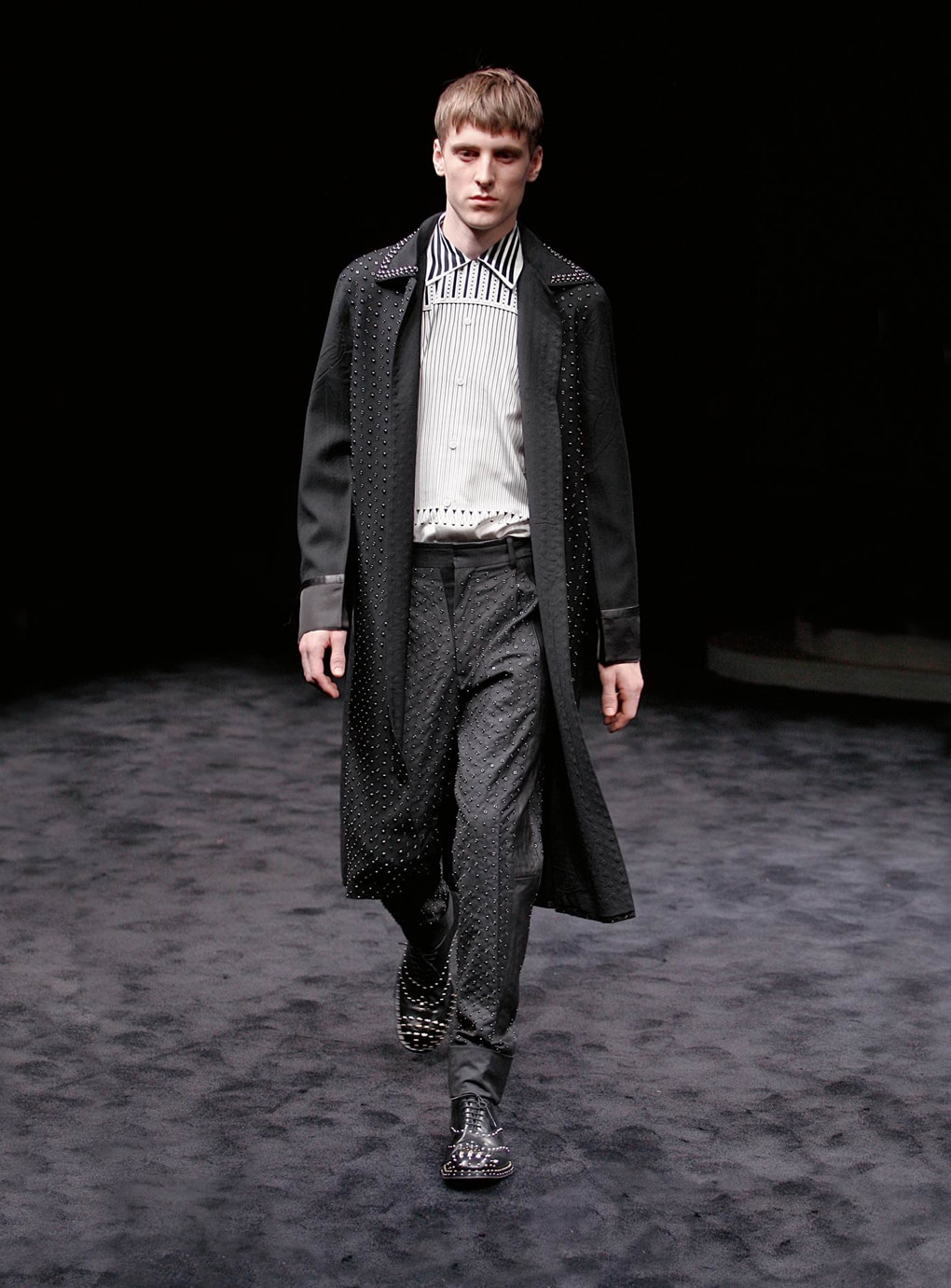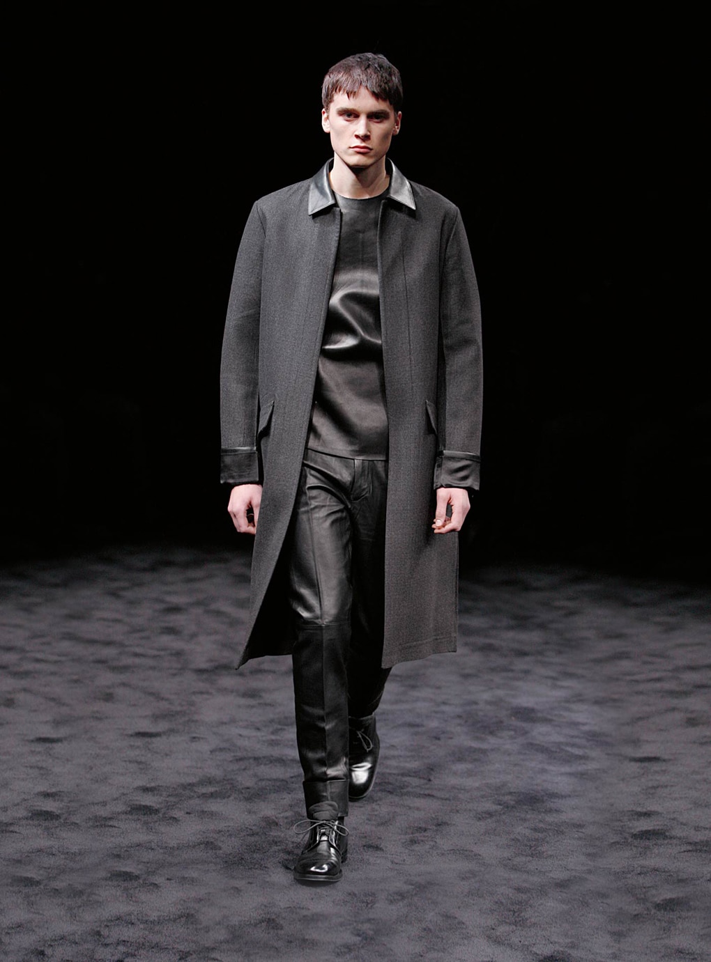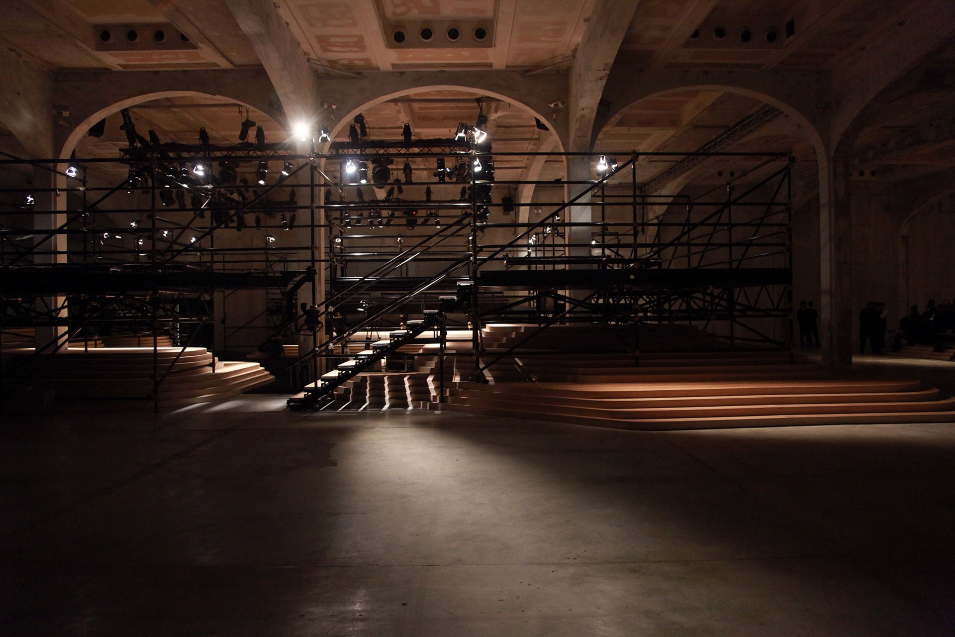 亲密氛围由此诞生: 模特们沿着几何路线在柔软的黑色地毯上走秀,观众则分散在四周不同高度的看台之上。