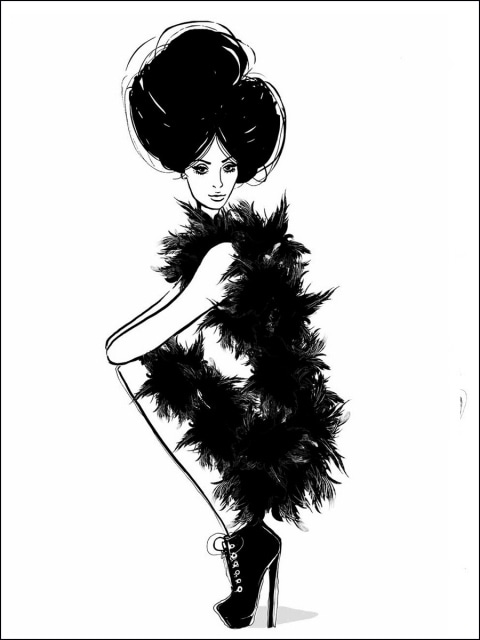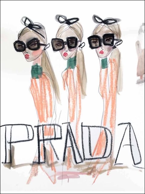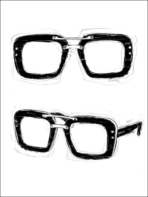 Megan Hess’s first instinct was to capture the boldness of the Prada SS15 designs—in this case, the black frames, steel bridge and top bar—in my magnetic black and white sketch work treatment. These frames sing the body electric.