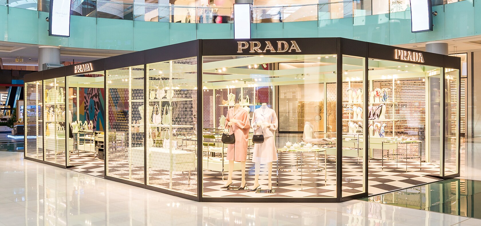 The space, located in the Fashion Catwalk, is defined by a multifaceted glass structure, decorated with triangle motifs that refer to the iconic Prada logo.