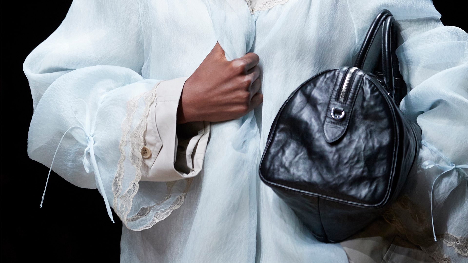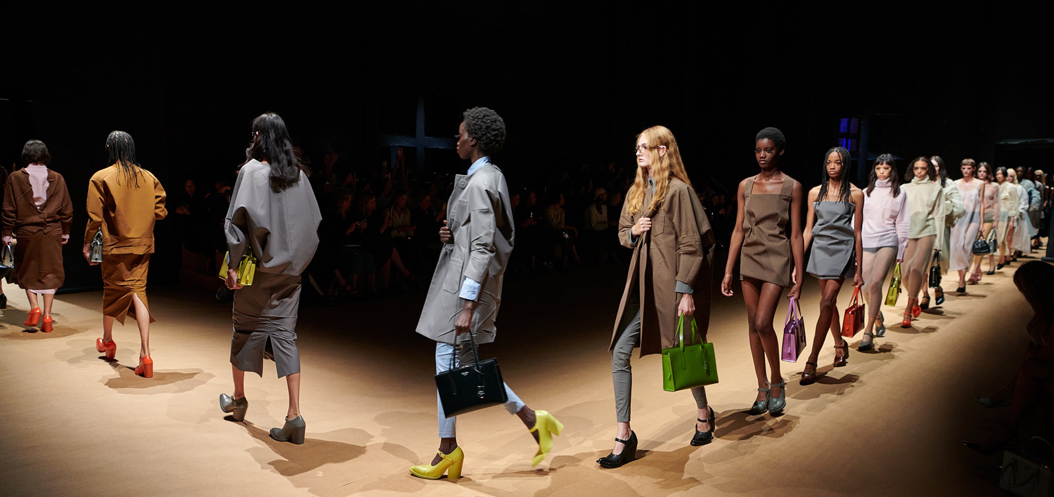 La ropa de día y de noche entremezcla sus signos y significantes: los abrigos de ópera se fusionan con las chaquetas de piel, mientras que la sastrería toma prestadas largas colas de tela. Ropa para la intimidad del hogar en delicados tonos pastel se fusiona con prendas de abrigo, desdibujando dos realidades distintas. Al mismo tiempo, la noción del uniforme Prada, presente en bodies de popelín de camisa en colores industriales, denota una realidad minimalista. Los accesorios se proponen en napa antigua y con superficies patinadas, prensadas y arrugadas que reinterpretan las siluetas arquetípicas y clásicas de los bolsos Prada. Se exploran las polaridades entre el minimalismo y la ornamentación, la ocasión y lo cotidiano; como en la vida real, se observan, exploran y adoptan dicotomías imprevistas.