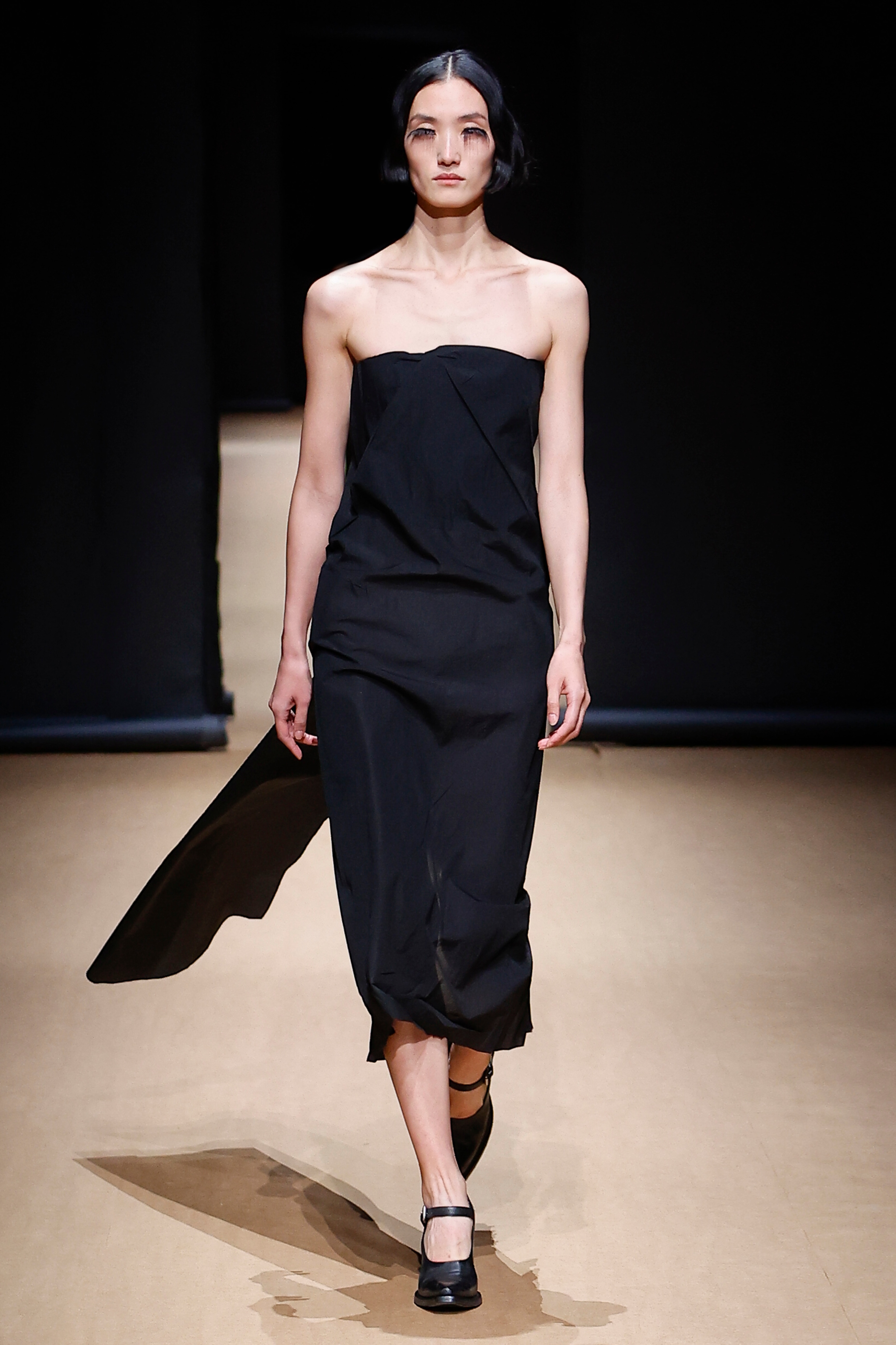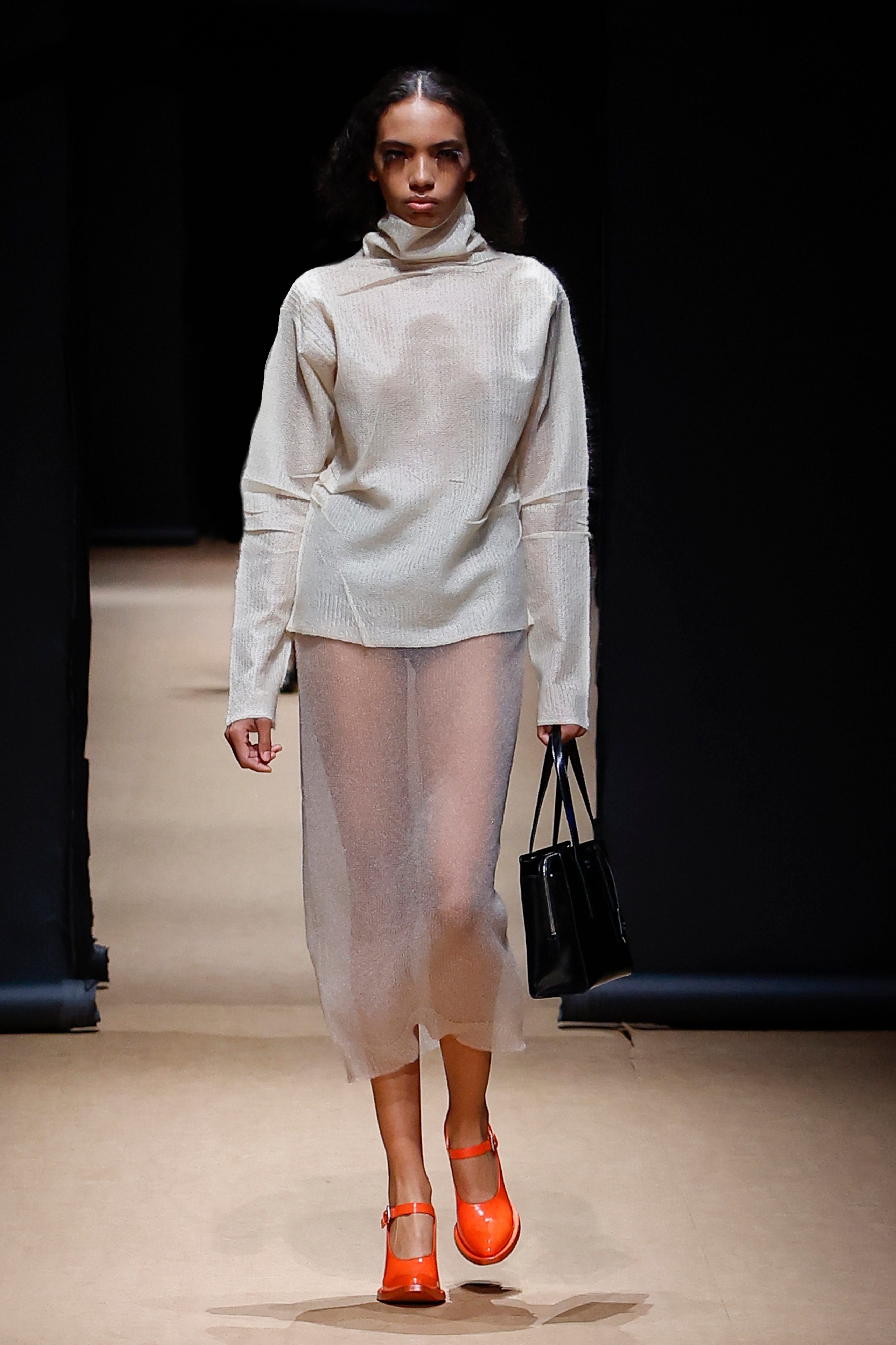 La colección atraviesa diferentes visiones y realidades en un juego constante entre la disimilitud y la paradoja. Reflejando la escenografía del desfile (protagonizada por un panóptico de papel negro, una sublimación de la esfera doméstica, un mundo en sí mismo) se utiliza un tejido a base de papel en una serie de vestidos, desgarrados y ceñidos al cuerpo, íntimos e impulsivos. Los gestos humanos animan las superficies: las huellas de la vida dan forma a las siluetas de las prendas, con tejidos rasgados intencionalmente, arrugas y pliegues que capturan la espontaneidad, como recuerdos de belleza incrustados en la tela.